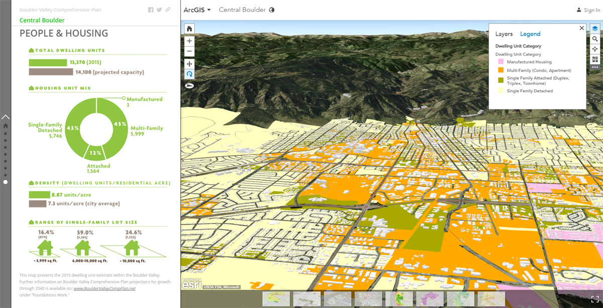 The City of Boulder and Boulder County are using Esri Story Maps and the 3D scene services with info graphics to explore new ways of communicating with the public at each stage of the Boulder Valley Comprehensive Plan update.