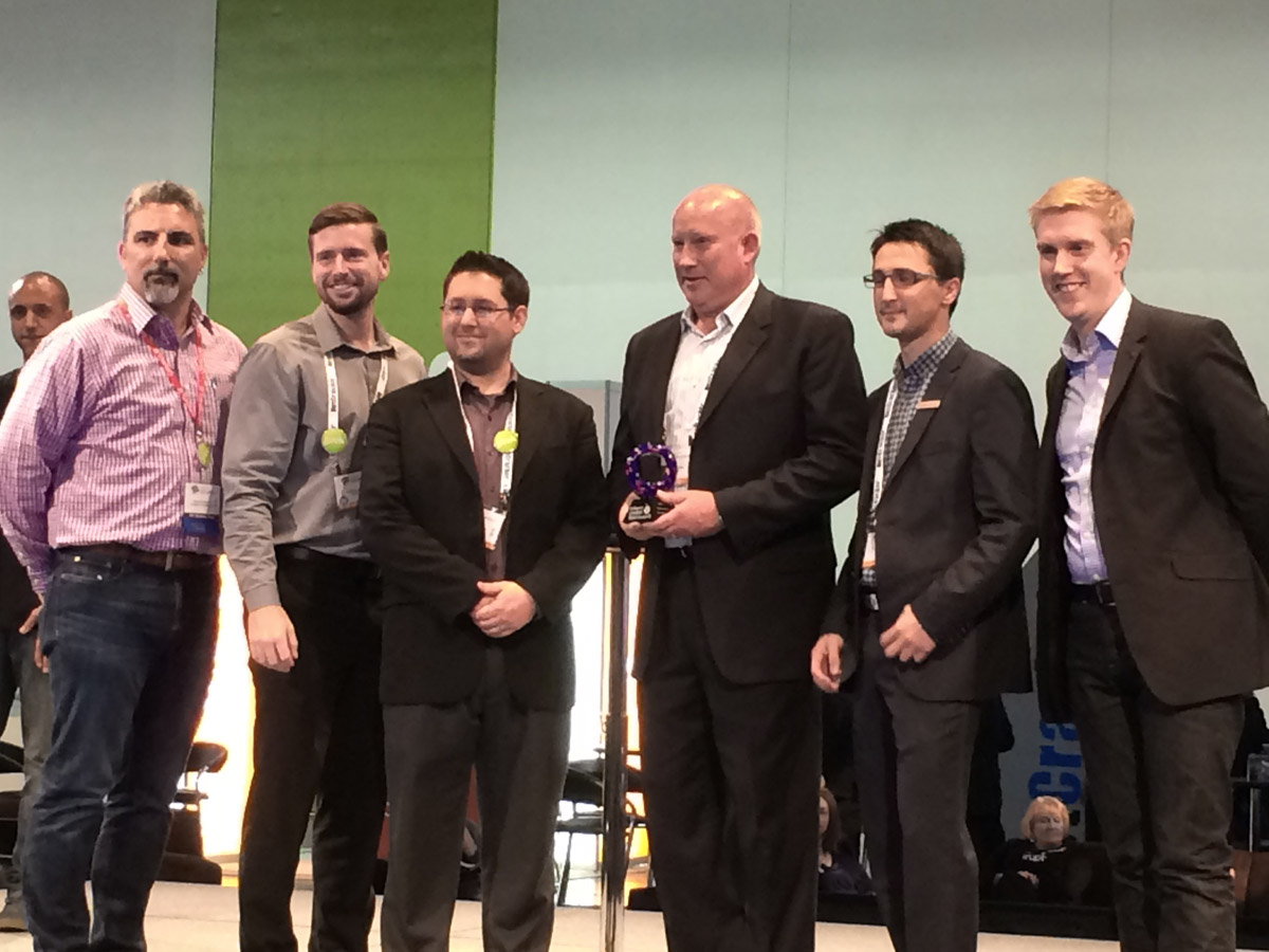 TM Forum presents Esri, BaseN, and Infonova the Most Significant Contribution to Frameworx Award. From left to right: James Hitchcock (TM Forum), Patrick Huls (Esri), Dave Twichell (Esri), Anders Viden (BaseN), Vedran Bratic (Infonova), and Nik Willetts (TM Forum).