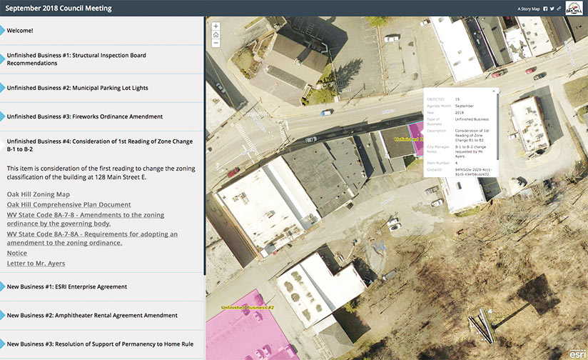 Since Esri released the first Esri Story Maps app in 2014, people around the world have built about 640,000 maps. But Oak Hill’s story map designed specifically for city council agendas seems to be a first.