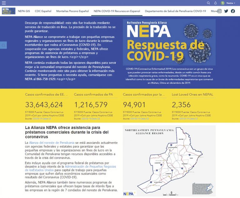 It was the first time Ginocchetti had worked with ArcGIS Hub. She used the COVID-19 template to create a localized version of Johns Hopkins University’s now-famous dashboard. She then added some pages with information about all the state- and federally funded loans that were becoming available for small businesses. When Ginocchetti heard that Spanish speakers in northeastern Pennsylvania were having a hard time figuring out what was going on with the pandemic, she reached out to Esri’s ArcGIS Hub team to see if a Spanish-language version was available. There wasn’t one, but the team started working on it right away. In the meantime, Ginocchetti put her whole hub site, paragraph by paragraph, into Google Translate to at least get some Spanish-language information out.
