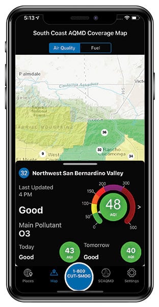 Maps are an integral part of the South Coast AQMD app. People who download the app will find a map showing the current and next day’s air quality information and another map displaying locations of alternative fuel stations for places they select. By enabling the geolocation features on the app, users will receive the most up-to-date air quality information in their current city.