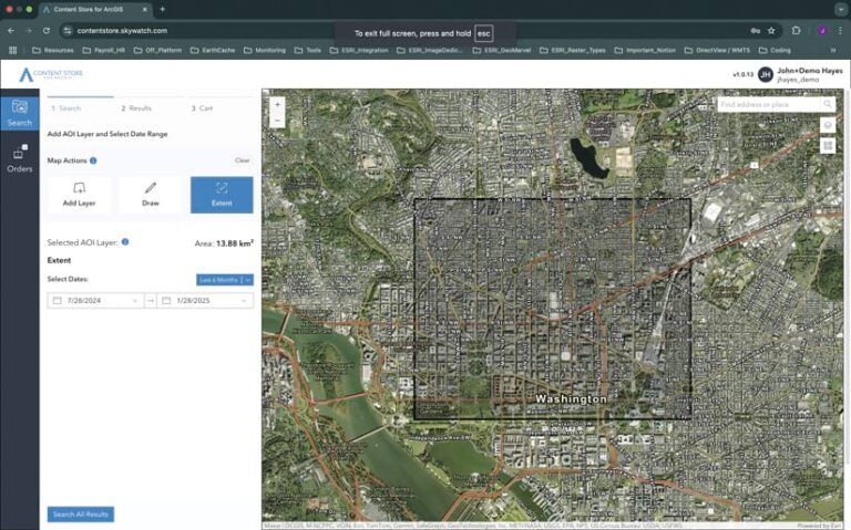Content Store for ArcGIS—jointly created by teams from ArcGIS Living Atlas and Esri partner SkyWatch—features imagery from Esri’s cornerstone partner, Maxar, as well as many other providers, including Esri partners Airbus and Planet. For organizations, Content Store simplifies the process of purchasing premium commercial satellite imagery, and for users, it enables them to quickly discover, integrate, and apply imagery to their projects. Users can search Content Store for satellite images based on an area of interest, purchase them, and immediately add them directly to ArcGIS projects.