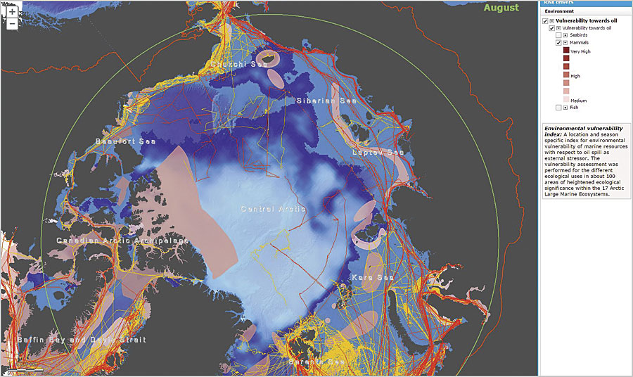 The Arctic Risk Map includes data on where fish, mammals, and seabirds breed, feed, live, and migrate. The map is broken into 17 Large Marine Ecosystems (LMEs), a decades-old concept that the Arctic Council adopted to encourage an ecosystem-based approach to management in the region. The Arctic Risk Map‘s environmental vulnerability index combines wildlife data with a map of the LMEs to let users see how external factors, such as oil spills, would affect these species and their habitats. It also shows where shipping lanes and wildlife habitats increasingly overlap.