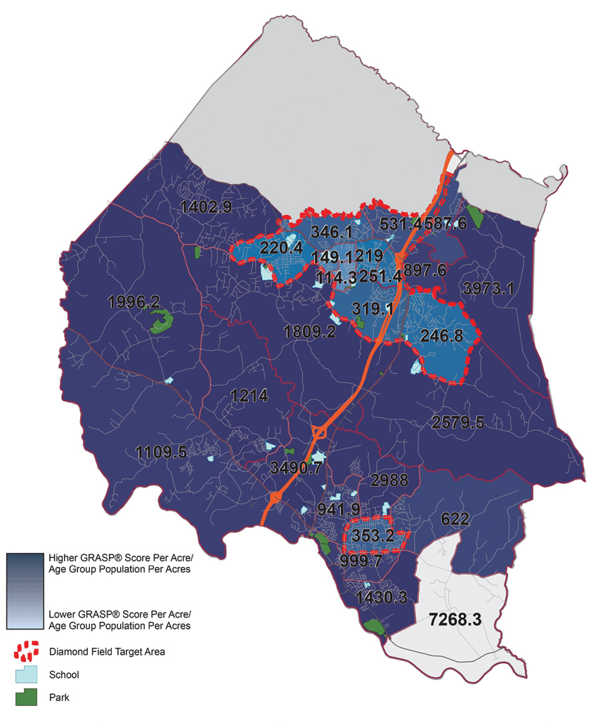 The final analysis accounted for population density by census tract and calculated an average value per acre based on the population of the 5–19 age group. This analysis highlighted two types of areas. Areas with lower field values and higher youth populations were isolated within Stafford County as target areas for improving existing ball fields or adding new ones. This analysis provided county staff with clear answers for use in their future planning efforts.