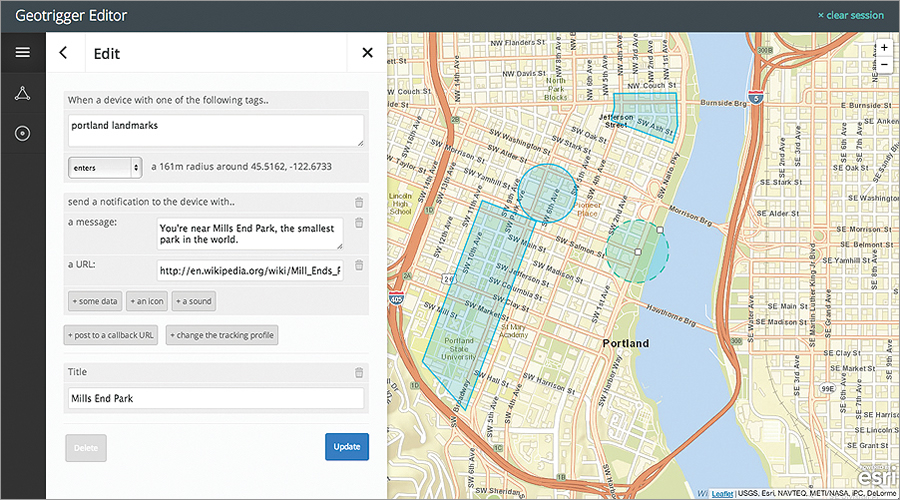 Once developers include the Geotrigger SDK in their iOS and/or Android app, it will be able to send and receive location data from a cloud-based streaming server in real time. Then, developers can define points or polygons of interest using the Geotrigger API and set the action they want to happen when someone enters the “trigger zone”—whether that’s to send a push notification message; log the time until they leave the area; or post a callback to an external service, such as a customer relationship management system.
