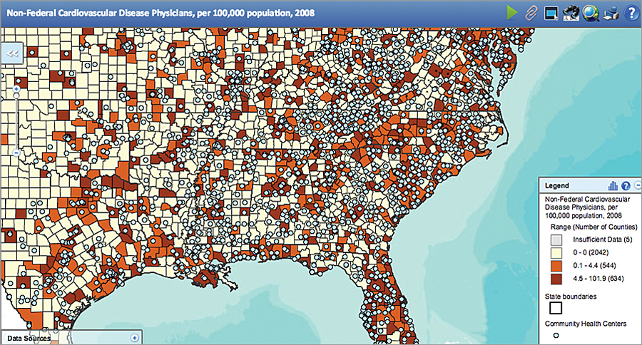 Built using Esri ArcGIS for Server and ArcGIS API for Flex, the atlas provides a map-based view of where cardiovascular disease is occurring. The data comes from the United States Census Bureau, the National Center for Health Statistics, the Centers for Medicare and Medicaid Services, and other sources and is stored in Microsoft SQL Server. Geospatial data includes state and county boundaries; roads and streets; health care centers and hospitals; and retail outlets, such as grocery and convenience stores and fast-food restaurants.
