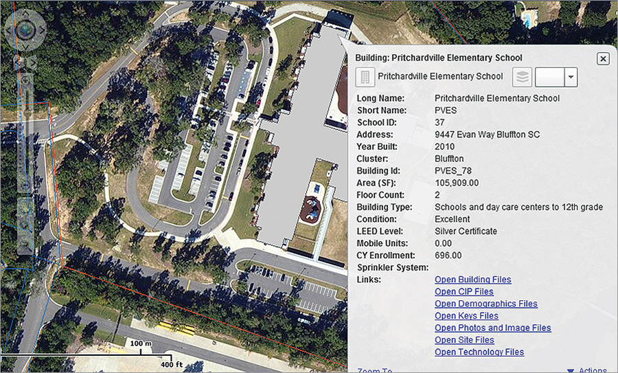 To use the system, a staff member simply clicks a particular school’s bookmark and the map zooms to that location. The user then clicks the building footprint to launch a pop-up window that has links to all the documents associated with the building, including design drawings, record drawings, CAD files, photographs, demographic information, equipment data, roof leak data, emergency evacuation plans, and construction closeout documents. This is important, as every structure, building, and renovation in the district has dozens of related files.