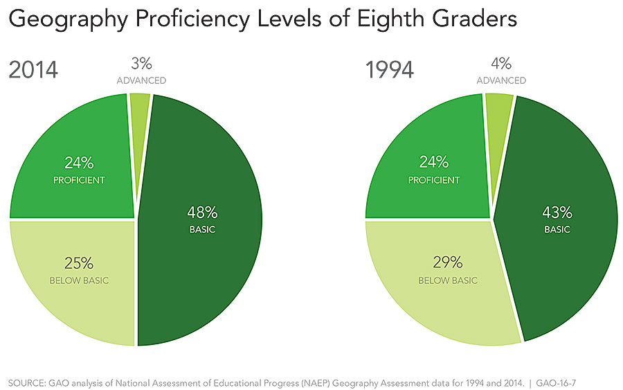 But only 27 percent of eighth grade students are proficient in geography, with just 3 percent of them in the advanced category. Meanwhile, 48 percent of eighth graders have just a basic understanding of the subject, while 25 percent scored below proficient.