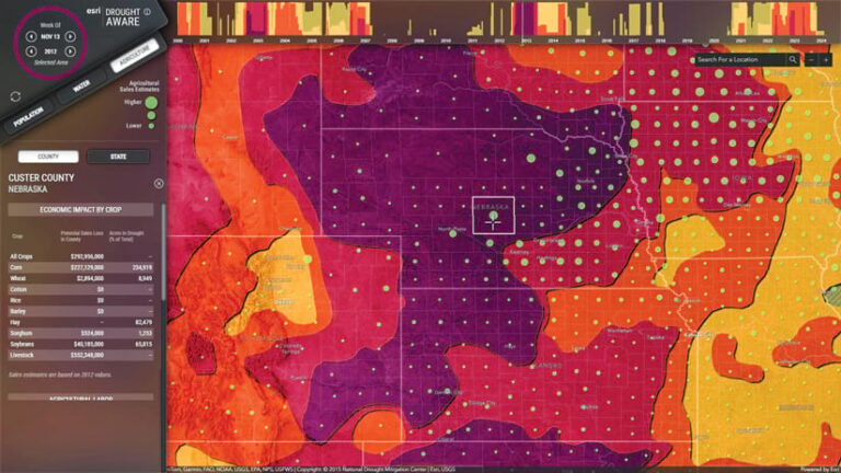 The Drought Aware app, available in ArcGIS Living Atlas of the World, provides information about drought-affected areas in the United States over various time intervals from 2000 to today and across different drought intensities.