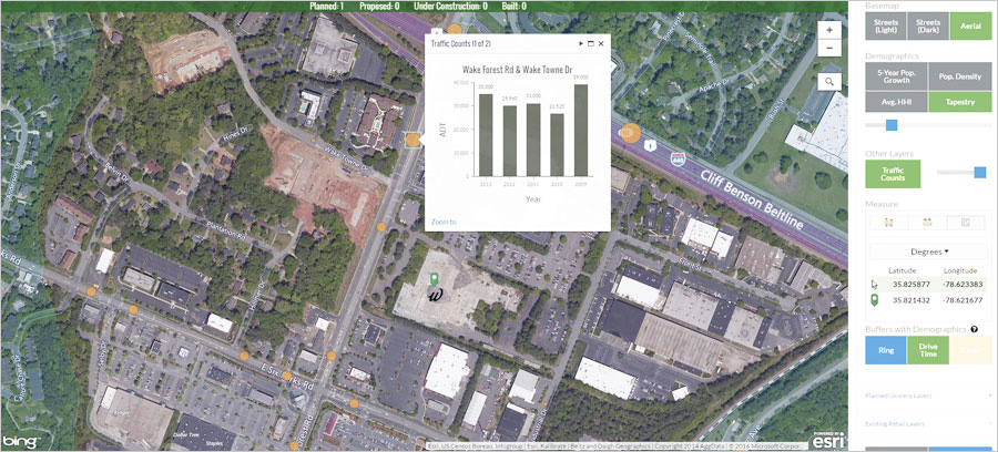 With the app—which runs in ArcGIS Online and is accessible via desktops and mobile devices—users can research grocery store locations that are proposed, planned, or under construction or have been built in the previous six months. The existing grocery store layers (with store identification numbers) are provided by another Esri partner, AggData, and the app lists the location, status, and square footage for each development, as well as the average daily traffic and demographics of the surrounding areas.