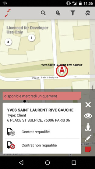 Employees can then take campaign information into the field using a mobile app that Sword built with ArcGIS Runtime SDK for Android. With the app, users can see the locations of client businesses, as well as geocode locations that haven’t been captured yet. They can also view and edit facts about clients, such as the status of their contracts and their hours of operation.