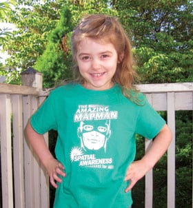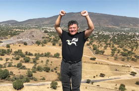 Daniel Munoz, the GIS manager for Orange County, New York, lets his community mapping T-shirt shine atop the Pyramid of the Sun in the ancient Mesoamerican city of Teotihuacan, Mexico.