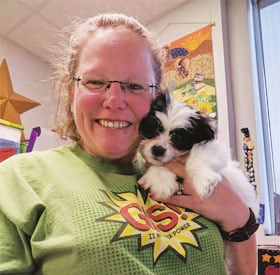 In Binghamton, New York, 4-H program coordinator Kelly Adams gives her GIS superpowers a bit of a break to give Rizzo, the office therapy pup, a quick snuggle.