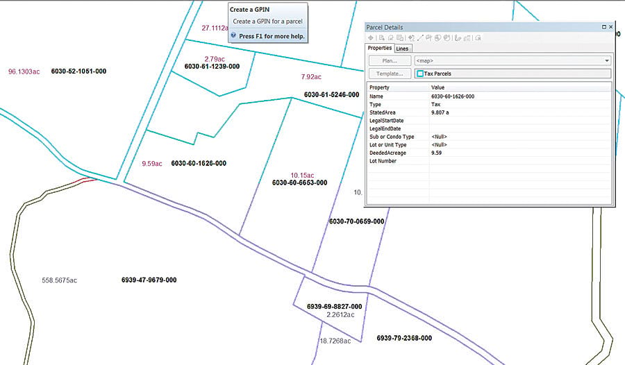 When Fauquier County’s tax parcel data was migrated from the legacy system to ArcGIS Desktop and the parcel fabric, Esri was able to build a custom GPIN tool that mirrored this procedure. The underlying grid is invisible to editors, but once they select the GPIN tool, they can click within a certain parcel to manually indicate its centroid and generate a unique GPIN. The parcel fabric then automatically puts the GPIN into the Parcel Details window and related tables.
