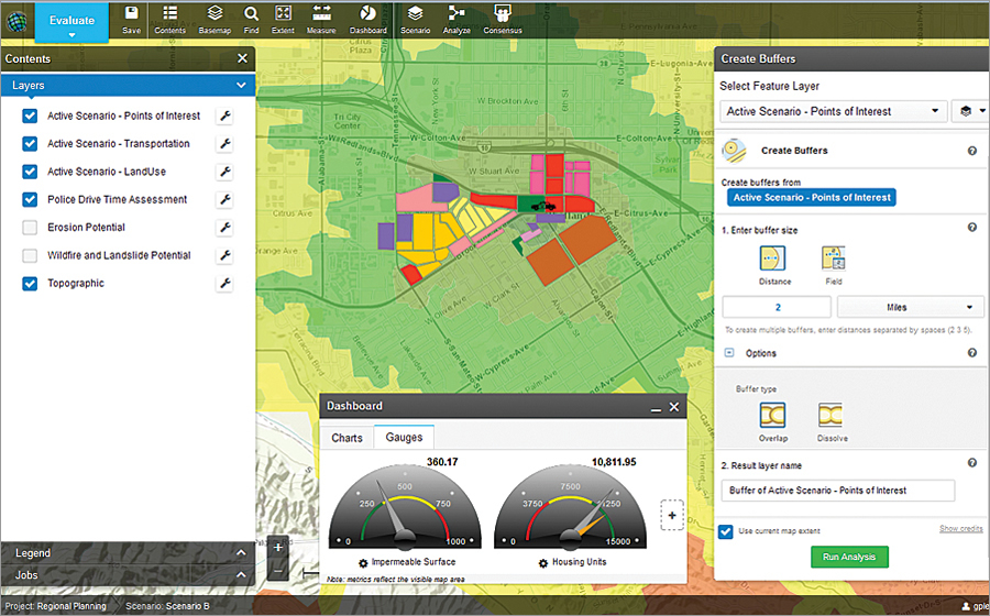 GeoPlanner for ArcGIS, available in ArcGIS Marketplace, provides tools that support every step in a planning and design workflow: project creation, data identification and incorporation, scenario creation, site condition assessments, evaluation and comparison of alternatives, and reporting. Users are able to create, analyze, and report on alternative planning scenarios in support of better, more informed decision making.