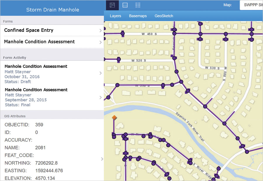 Using UtiliSync on their mobile devices, field crews from Salt Lake County now complete their inspection reports on-site. Because the solution is tightly integrated with ArcGIS, staff members can just tap on a map feature—such as a manhole, water valve, or construction site—and immediately find the correct form for that asset. After the inspection form is completed, UtiliSync automatically generates a PDF report and distributes it to the appropriate parties. It also saves a copy within the program itself for compliance purposes.