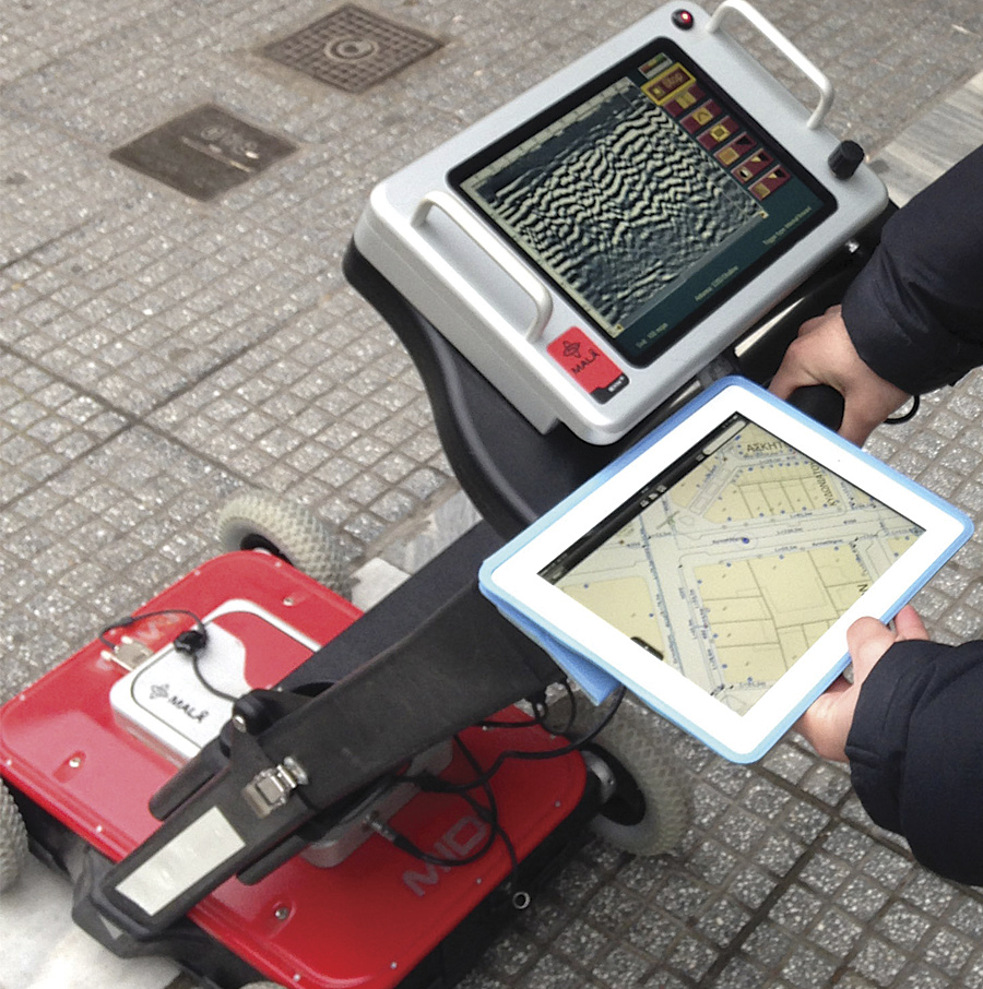 Aided by mobile GIS, an EYATh employee uses a ground-penetrating radar device to more accurately identify underground network assets.