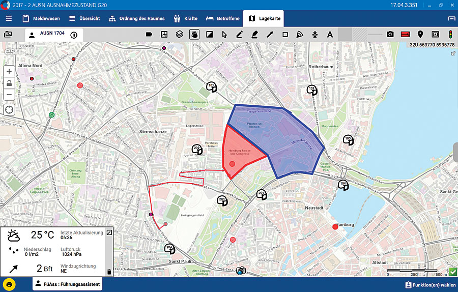 Using the new system for the OSCE meeting was largely a learning opportunity for how to use trailblazing technology and get a large command staff to work together and with people in the field. In the lead-up to the G20 conference, the Hamburg police have optimized digital connectivity between police headquarters and on-site personnel so that everyone uses the same digital map to get the same view of the event. Additional content has been added to the geoplatform, and further infrastructure improvements have been made as well.