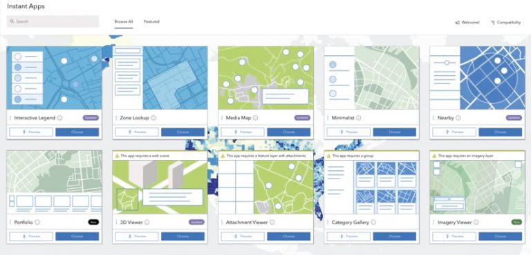The gallery includes focused apps, each with a specific purpose—for example, viewing a map, comparing two things, getting directions, or finding something nearby. Instant Apps guides users through the selection process by suggesting the best app template for the maps and data being presented. It does this by analyzing map components, like pop-ups, symbolization, and attachments, and then recommending app templates with compatible capabilities.