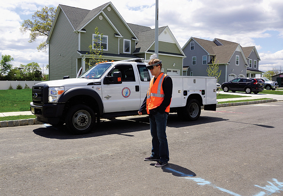 On Tuesday, May 2, Bundra set out to take one small step for the future of GIS, going where no other GIS specialist had ever gone. On a quiet street in Toms River, he stood on the sidewalk, adjusted his HoloLens headset, and launched Meemim’s vGIS app.