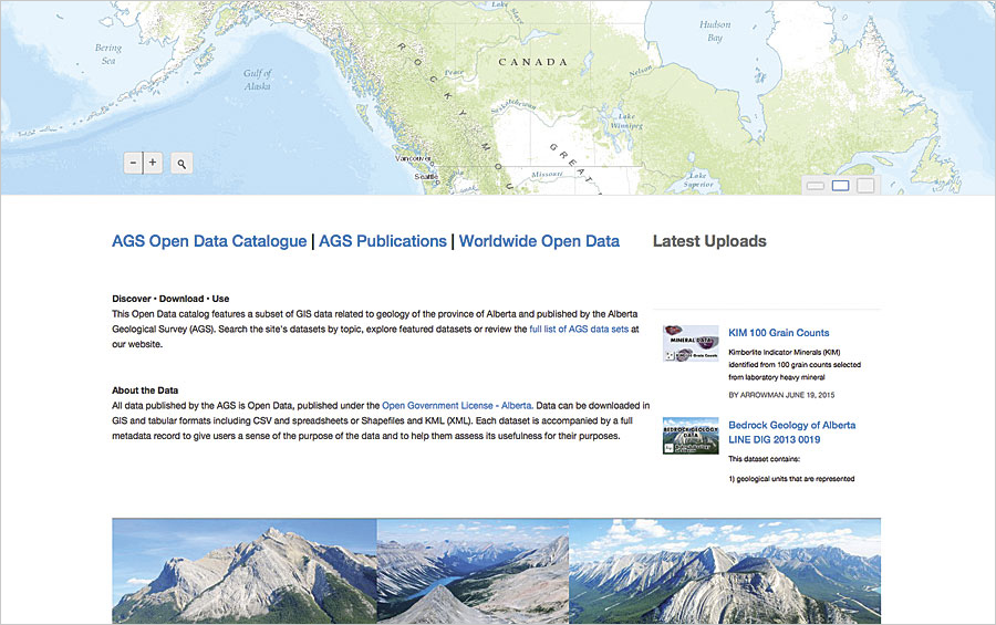 The Alberta Geological Survey in Canada uses ArcGIS Open Data to share GIS data about the geology of Alberta—from bedrock and surficial information to details about minerals. The site supports the organization’s interactive web mapping applications and augments its well-developed open data repository with active map services.