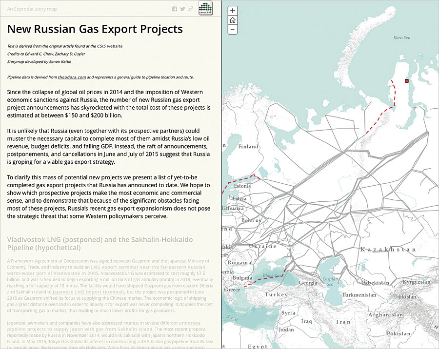 In partnership with the Centre for Strategic and International Studies (CSIS), Exprodat created a story map to accompany a report on pipeline projects under construction throughout Russia. The story map, called New Russian Gas Export Projects, shows existing and planned oil and gas pipelines in Russia alongside the text of the report and is intended to help readers better understand the detailed information.