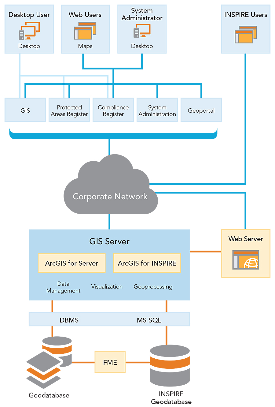 Based on this analysis, Esri Bulgaria designed a GIS for the protected areas. The GIS creates and maintains a single centralized database and powerful functionality, via desktop and the web, that uses Esri software: ArcGIS for Server, ArcGIS for Desktop, ArcGIS for INSPIRE, FME, and various extensions. Terabytes of data were processed, validated, verified, and integrated into the system. A total of 988 layers were incorporated into the geodatabase. A specific geodatabase with harmonized data was built and published via a special geoportal based on Esri Geoportal Server to meet the EU INSPIRE Directive.