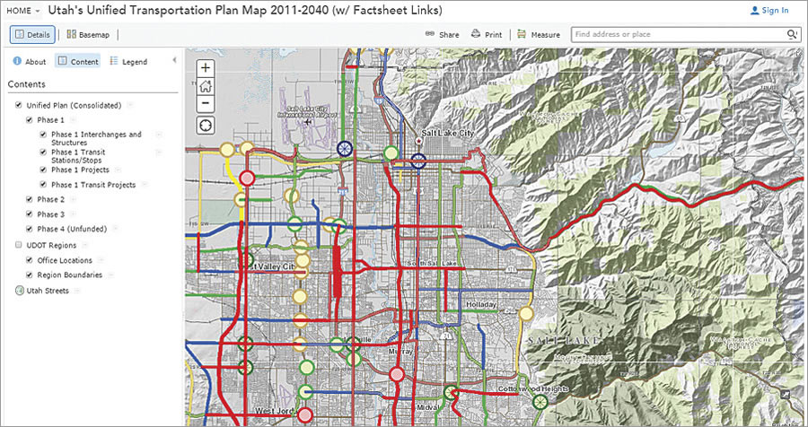 The Utah Department of Transportation (UDOT) uses ArcGIS Online to power UPLAN, an interactive mapping platform that includes information about the state’s unified transportation plan, pavement management, safety and crash analysis, bridge locations, bike lanes, mileposts, and more.
