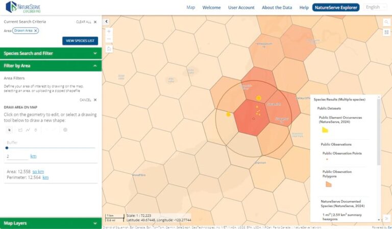 “At Weyerhaeuser, our commitment to sustainable forest management is paramount,” said Chad Leatherwood, senior sustainability transformation manager at Weyerhaeuser, an SFI-certified company that makes forest products. “The radius tool feature in Explorer Pro is a more recent improvement [that] allows us to more efficiently gather ecological data within a wood supply area, including species’ names and conservation status, empowering us to make informed decisions.”