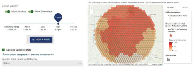 To create the database, developers first solicited feedback from members of the NatureServe Network. The members’ biggest concern was protecting sensitive species data, and each organization’s rules about data use were different. Based on members’ feedback, NatureServe created a portal that allows data providers to set permissions on how fine-scale their data is displayed. They can also obscure data for sensitive species. As a result, database users can access location data that is as precise as possible without compromising sensitive information.