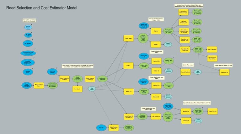 GIS analysts outfitted the roadway network with a typical pavement life cycle cost algorithm and input that into ModelBuilder. The algorithm determines what it would cost to replace sections of pavement based on their condition, dimensions, and thickness—and it even includes an annual escalation factor for increased material prices and labor rates. Having all this in ModelBuilder brought geoprocessing tools and Python scripting together to manage all the data associated with the project, automate and document workflows, and automatically generate maps and reports.