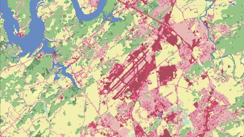 Using the deep learning model (first image) helped the Tennessee Department of Environment and Conservation (TDEC) create higher-resolution land-cover images of the entire state—including Knoxville, shown here—than was possible with the 30-meter land-cover imagery (second image) from the National Land Cover Database (NLDC).
