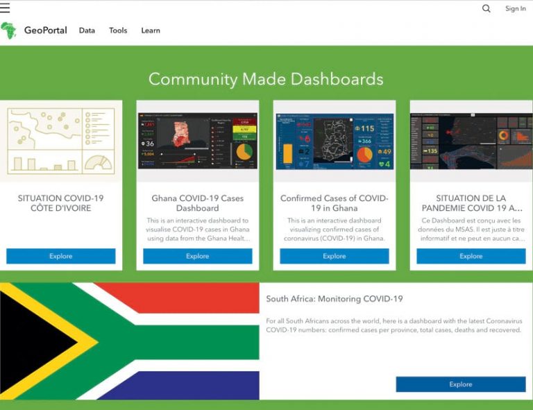 The Africa GeoPortal is powered by Esri technology. It comes with content from ArcGIS Living Atlas of the World that’s specially curated so it relates directly to Africa. Users also get access to ArcGIS Online; apps and analytical tools such as ArcGIS Collector, ArcGIS Survey123, ArcGIS StoryMaps, and ArcGIS Insights; and a large selection of Esri’s e-Learning materials.