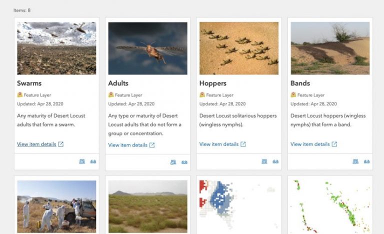 Another subsection of the home page spotlights data about the desert locust crisis afflicting the Horn of Africa. It points users primarily to an open data hub built by the United Nations’ Food and Agriculture Organization (FAO), as well as other datasets on locust swarms, control operations, hot spots, and more.