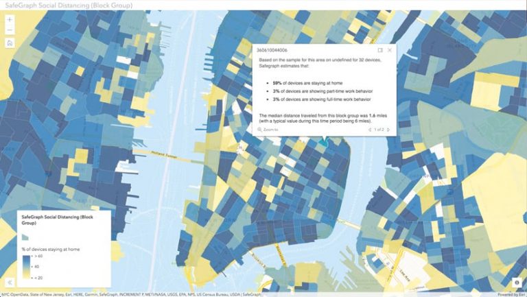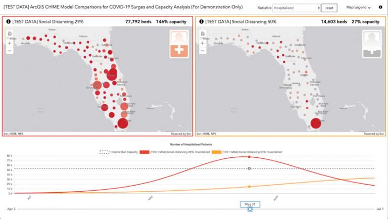 Spatial analysis and data visualization are enhancing surge capacity models that are meant to predict, over time, the number of people who will require hospital care, intensive care, and respiratory assistance with ventilators. Running those models to show various levels of adherence to social distancing policies and comparing the results with local health-care infrastructure capacity offer insight that can help plan for future needs. For example, if the current level of social distancing predicts a need for more hospital beds than a region has available, local leaders use GIS to site alternate treatment centers to augment capacity and better serve the community.