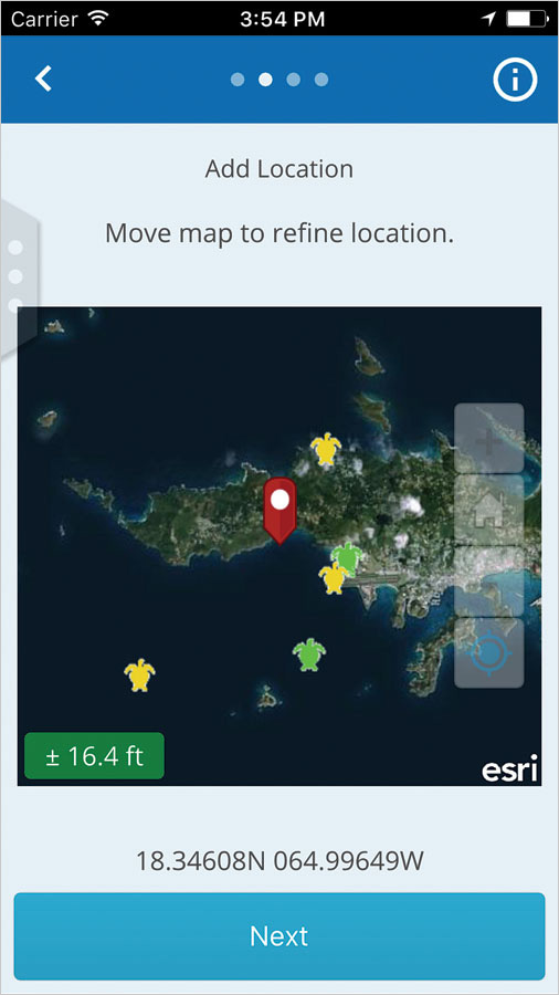 When TURT app users see a sea turtle, they can submit photos, comments and observations, weather conditions, the date and time of the siting, and the geographic location. Once data is added to the TURT app, it is automatically and instantaneously uploaded to a global sea turtle database via a web map stored in ArcGIS Online. Researchers and conservationists can then use the information to analyze trends and hot spots to assess the distribution, health, and migration activities of various sea turtle species.