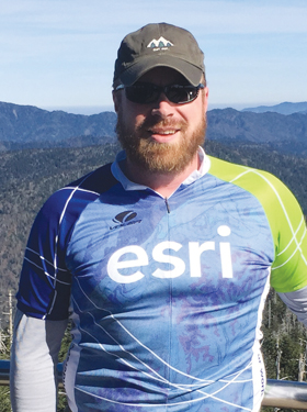 Gretchen Brown, CAD/GIS specialist for the City of Bainbridge Island in Washington State, dons an Esri cycling jersey while mountain biking on the Lower Big Quilcene Trail in the Olympic National Forest.