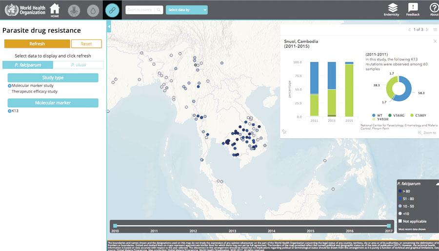 The Malaria Threats Map is the sole consolidated source for linked spatial and analytical data on these three trends, and it is available in English, French, and Spanish. With the development phase of the project completed in 2017, there are plans to implement Phase II—adding more data indicators and functionality—in 2018.