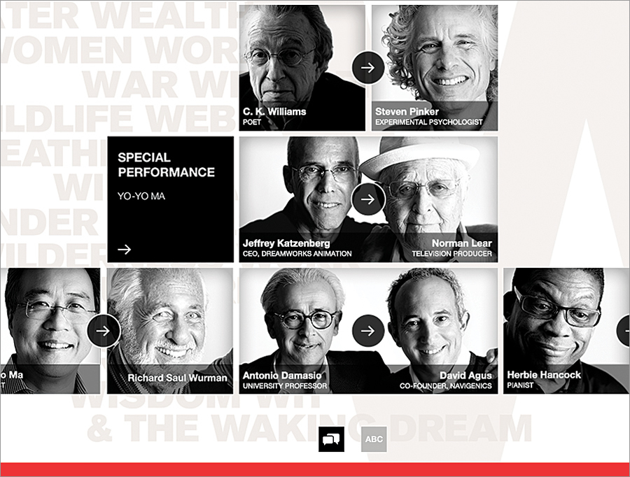 The WWW app showcases the intimacy of the individual and the power of the idea through its elegant filming and presentation style. Choose a conversation, speaker details, or supplemental material—it’s all available in an intuitive mobile environment.
