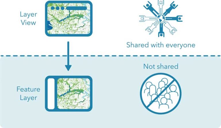 A hosted feature layer view looks and acts like a hosted feature layer but doesn’t have its own data. As the name implies, layer views are simply a second view of a hosted feature layer that lets you maintain a public-facing view while keeping its feature layer hidden.