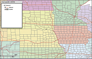 A group or layer only becomes visible if the FIPS code is within the range of values listed in the tag’s states attribute. If it is, the legend dynamically changes. Each <layer> tag also has an id attribute that has a value that corresponds to the layer ID value used by the map service. These values are used to set the visibleLayers array of the map service. Tiny PNG files (measuring only 28 by 16 pixels) are used to represent the symbol for each layer.