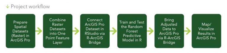The eight spatial datasets (i.e., the ChangedToUrban dataset plus seven explanatory datasets) were prepared and processed in ArcGIS Pro. The raster datasets were converted into a single point feature layer, which was passed via R-ArcGIS Bridge to R as an R data frame. R was used to train and test the Random Forest model and create predictions. Finally, the predictions were passed back to ArcGIS Pro via the R-ArcGIS Bridge to visualize the results.