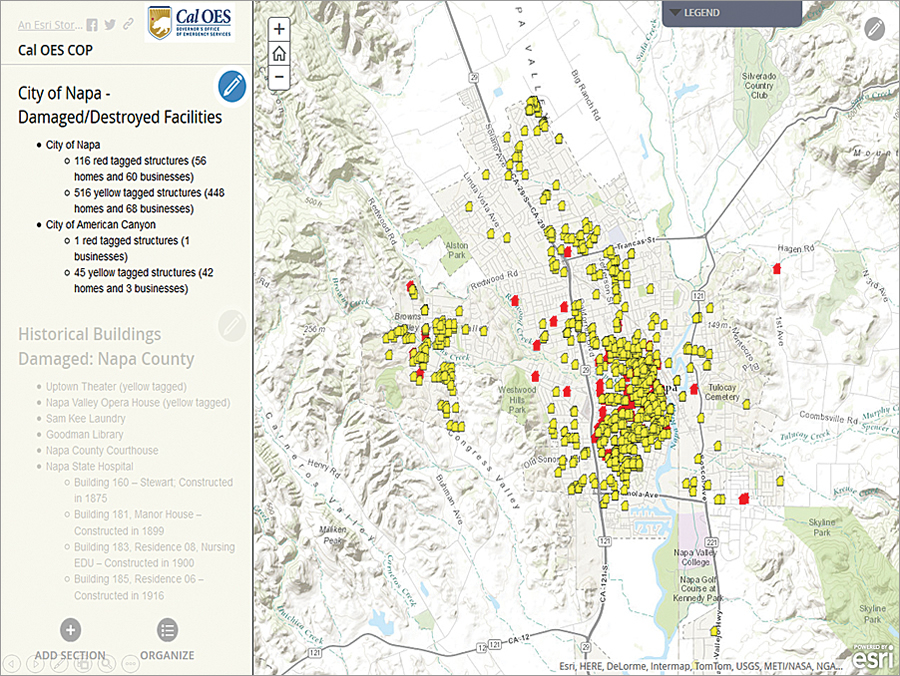 Using data that Cal OES published, DRP produced an Esri Map Journal Story Map about the agency’s response that Cal OES executives adopted as its common operating picture (COP). The locations of damaged and destroyed facilities, geolocated and mapped by Cal OES, were added to this story map as well as damaged historical buildings. The Story Map Journal app provided a geospatial context to information that was disseminated during the twice-daily executive briefings.