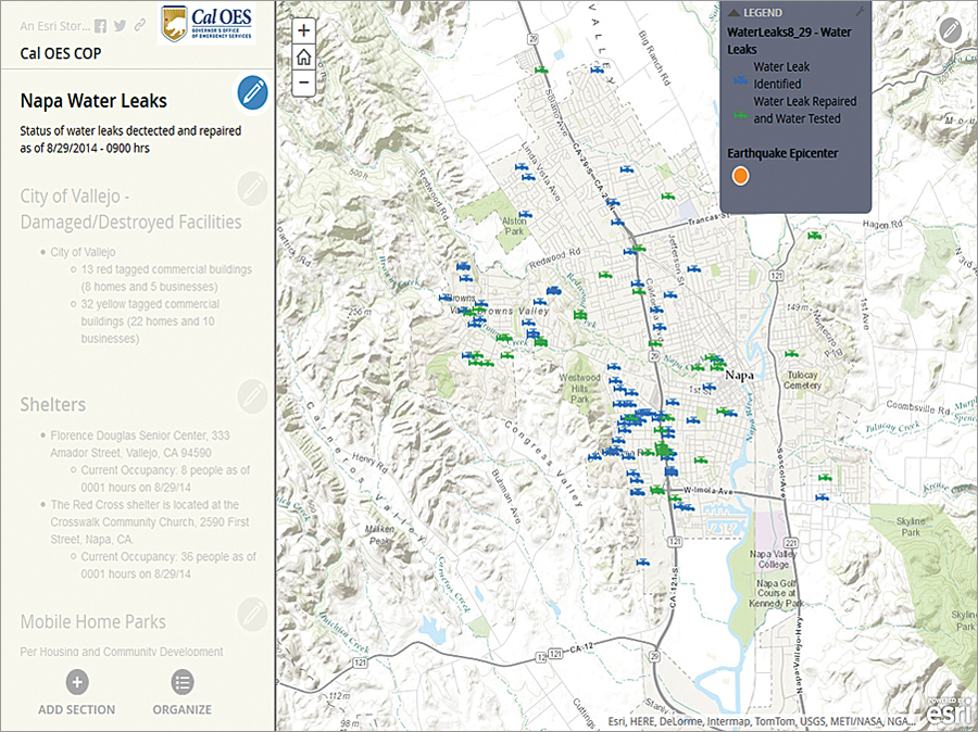 The City of Napa shared its constantly updated authoritative data on water leak locations and the status of repairs via the ArcGIS Online Group. This data was incorporated into the Story Map Journal so Cal OES executives and SOC staff could quickly access it for planning purposes. The locations of damaged facilities in the City of Vallejo, available shelters, the damage sustained by mobile home parks in the surrounding area, the status of nearby medical and health care facilities, and water stations opened in response to concerns over bacterial levels in drinking water were also incorporated.