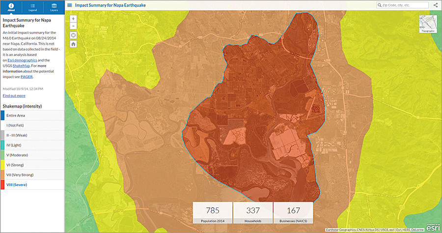 The Napa Earthquake Information map became the go-to resource for current information about the earthquake. It was shown live on KRON Channel 4 and was embedded in numerous newspapers and television station websites. By the end of the first day and a half it was available, the web app received 150,000 hits while using only 0.2 ArcGIS Online account credits.
