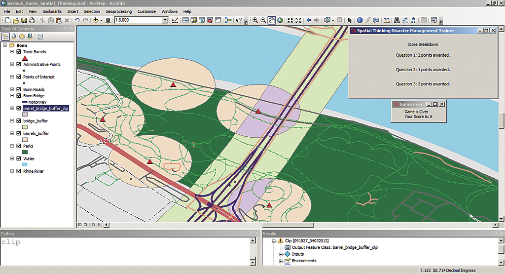 The game uses a disaster response scenario where toxic substances have washed up on the shore of the Rhine River in Bonn, Germany, after a flood. The game player is given a series of questions designed to measure spatial thinking abilities based on which ArcGIS tools they would use to respond to the disaster. Using real GIS data and tools in the game makes it particularly useful for realistic disaster management training. The following sections discuss the game in further detail and provide ideas for future work.