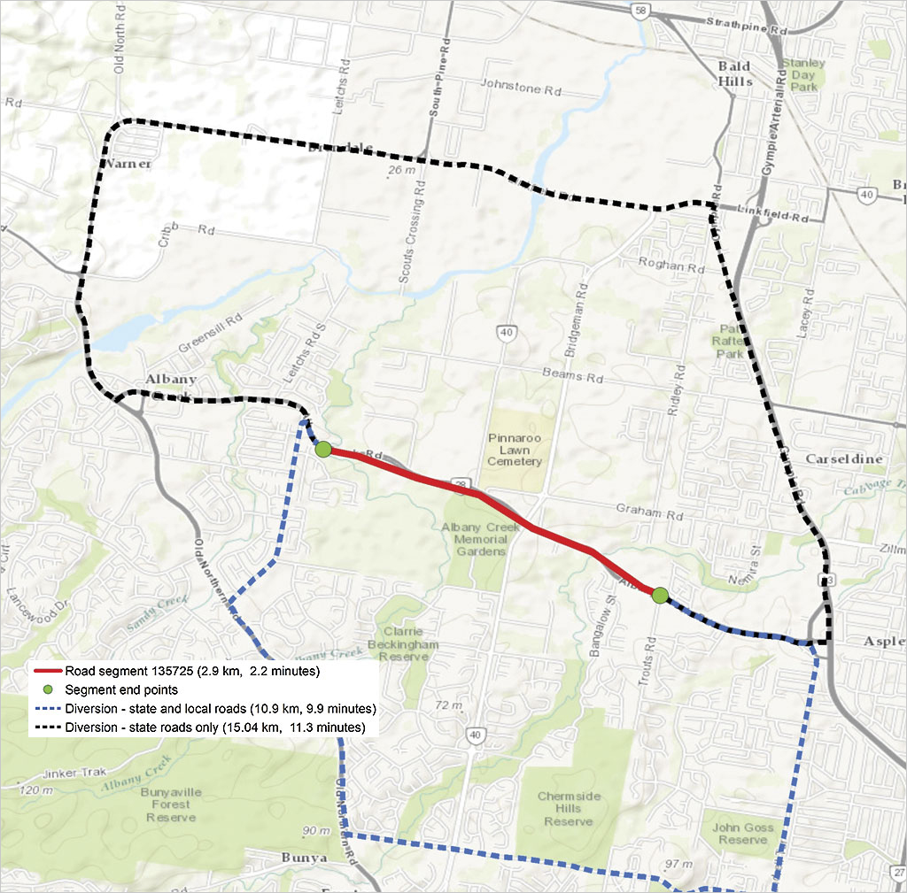 To properly understand the impact of road closure events on road users, more than just quantifying road closure duration is needed. When a closure event occurs, road users will either abandon their trip, wait, or divert around the closure to continue their trip. So modeling the distance and travel time of diversions around each road segment is a key aspect of this framework that will measure the significance of a road segment. Larger diversions have a greater economic impact on road users.