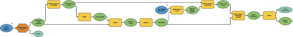 The overall solution for modeling road segment diversions can be created by integrating ArcGIS Network Analyst tools with ModelBuilder iterators. This allows the network analysis scenarios to be built separately and solved for all road segments as part of a single model run. The output from the model was a feature class of all diversion route polylines with statistics for the diversion distance and travel time. The travel time was based on speed assumptions for all road hierarchy types.