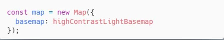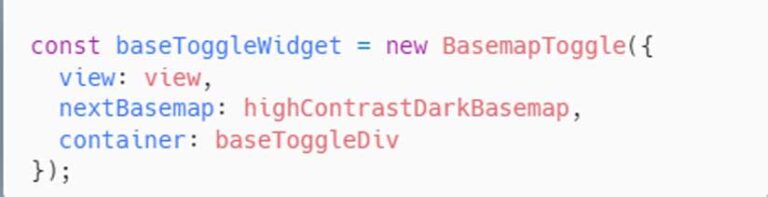 There are several ways you can improve the contrast of maps to showcase solutions to a wider audience while supporting the success criterion. One method is to toggle between high-contrast basemaps. Switch between high-contrast light and dark basemaps using the BasemapToggle widget. To do this, add high-contrast basemaps as objects, as shown in Listing 1. Next, set the map’s basemap property to the light basemap, as shown in Listing 2.