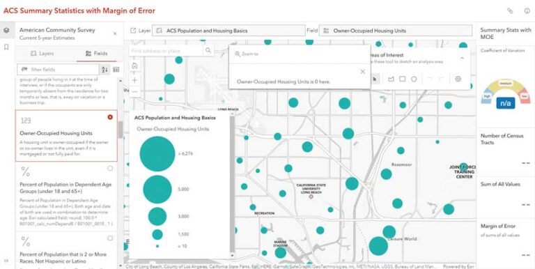 A lightweight app, ACS Summary Statistics with Margin of Error, is available at no charge to help you get a quick sense of how many tracts you’ll need to aggregate to get an estimate that meets your desired level of reliability. The left panel of the app lets you search and select layers and attributes. If you select a count, the tract centroids will be symbolized by size. If you select percentage, the tract centroids will be symbolized by color.